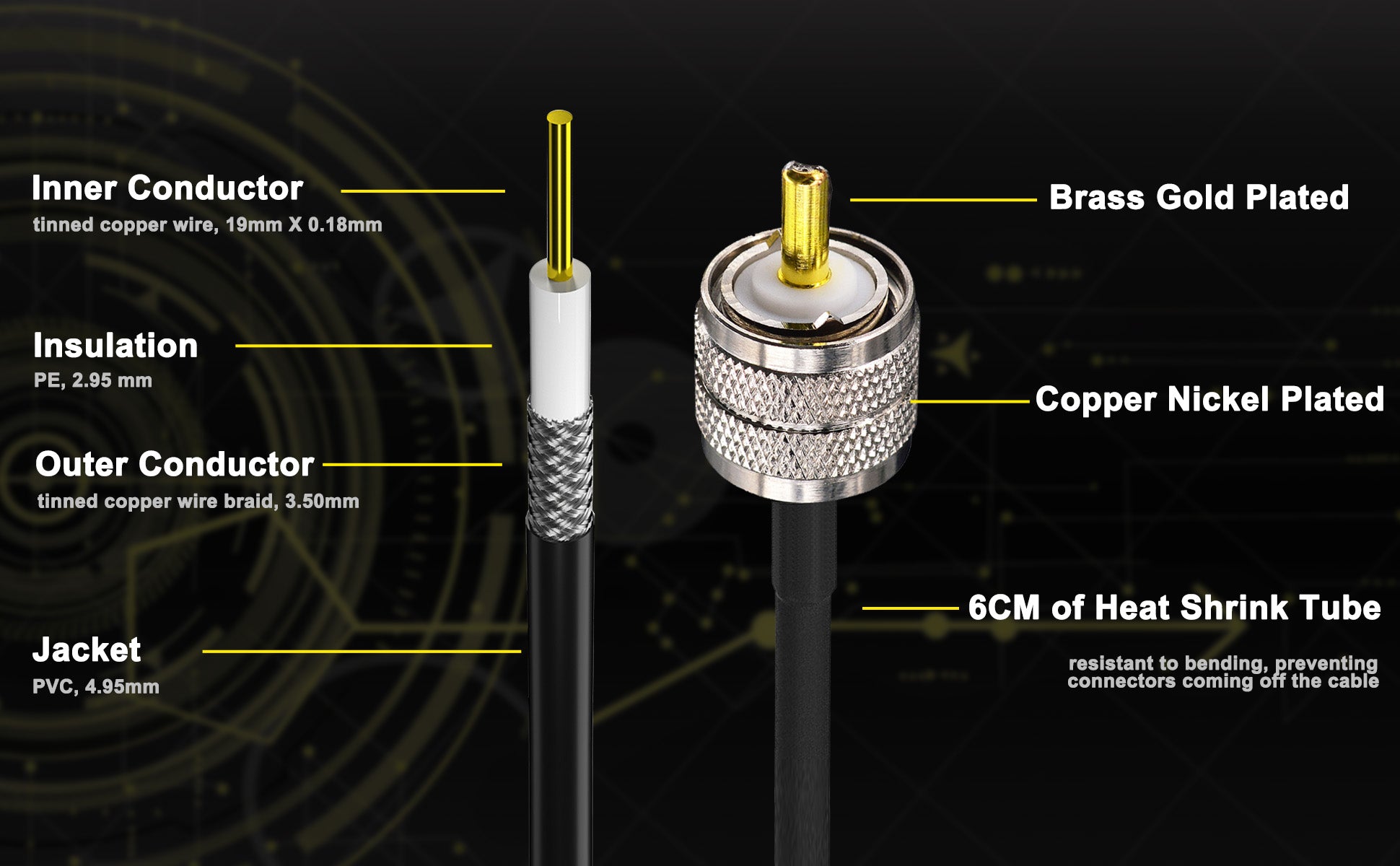 - ⭐【Heat shrink tube lengthened to 6 cm】- Compared with other UHF cable, our upgraded tube has been lengthened to 6cm, both ends are heat shrinkable and firmly connected, which make the UHF male pl259 connectors of the patch cable firmer and effectively, preventing the connectors from detaching due to bending or pulling.