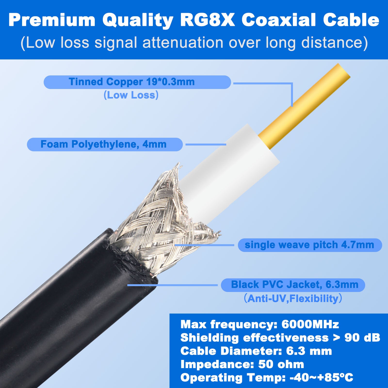 - 【Premium Quality】- RG8X Cable is made from tinned copper center conductor, foam polyethylene insulation, and braided copper shielding, pvc jacket. This ensures durability and excellent signal transmission quality