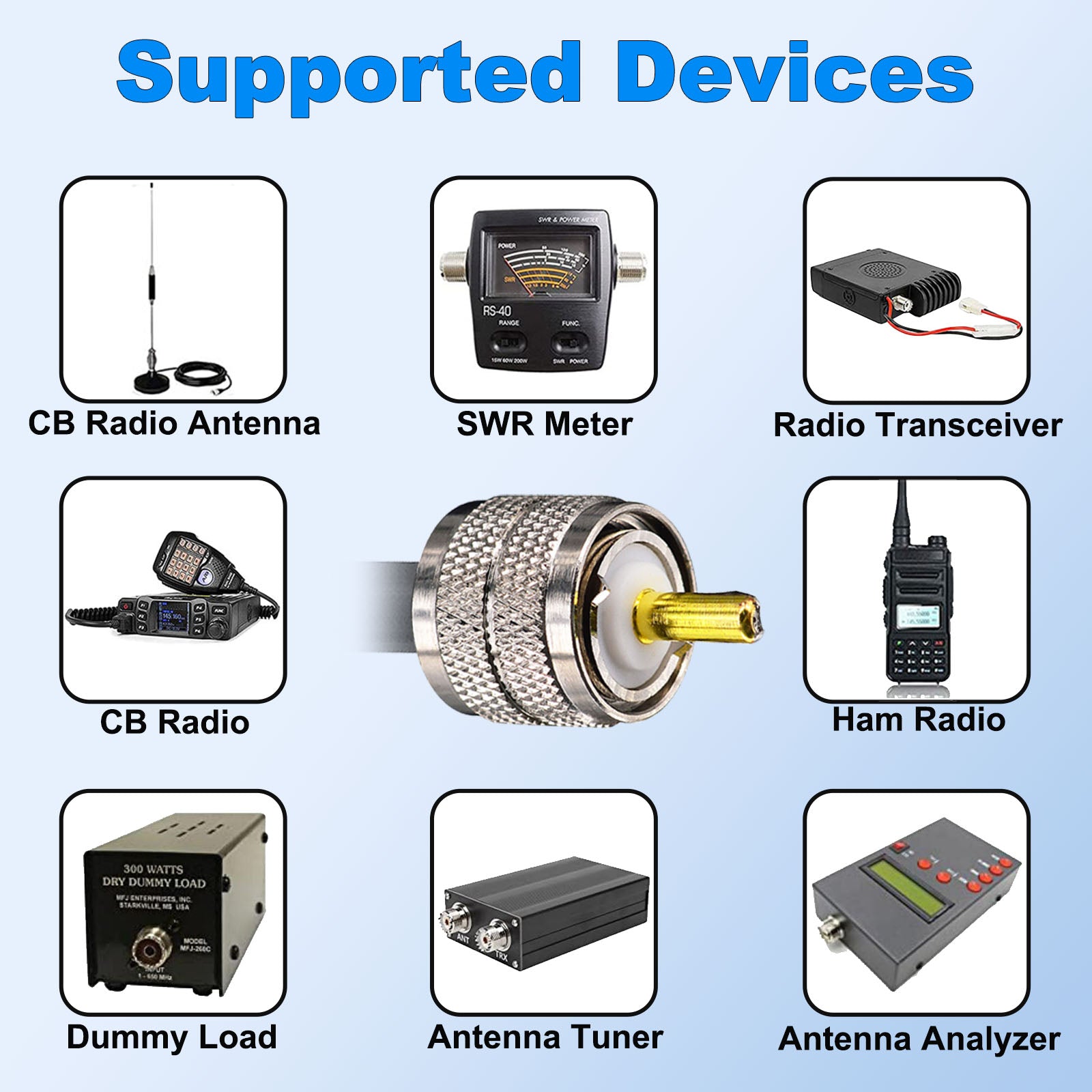 - 【Application】- 50 ohm pl259 cable rg8x is widely used in CB radio, ham radio, two-way radio, amateur radio, HF/VHF Radio, antenna analyzer, antenna tuner,SWR meter, antenna transceiver, base stations, etc.